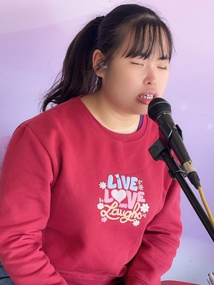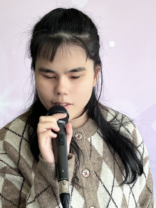 一歲半時細菌感染導致左眼摘除,我的世界從此剩下一半光明,十四歲國中時因一場意外,右眼眼球也嚴重破裂,讓我原本一半的世界,正式走入全然看不見的黑暗,但卻也因此開啟我對聲音最敏銳最光明的直覺。台中啟明學校開設「希望課程」的音樂培訓,成為我音樂學習的重要起點。老師教我正確的發聲方式,讓我能在保護聲帶的前提下穩定歌唱,也引導我如何運用聲音與語言,與外界的人溝通交流。對當時剛失去全部視力的我而言,希望課程像是在黑暗中點亮的一盞燈,讓我重新找回方向。我曾是啟明學校樂團主唱,也是校園晚會的司儀,學習如何透過語氣、節奏與情緒掌控現場氣氛,讓聲音成為引導與連結他人的工具,這也讓我對「聲音的力量」有了更深刻的體會。從主唱到大學文化傳播系的文字薰陶,我學會將生命的韌性揉進歌聲裡,我熱愛生命、喜歡挑戰,喜歡音樂的我接觸過古典鋼琴、小提琴、陶笛、爵士鼓等樂器,也學習流行鋼琴,希望能用自己的歌聲告訴這個世界:「雖然眼睛看不到,但我不認為有什麼事我做不到。」只要心裡有光,就能走得遠,音樂讓我看見無限可能,只要願意嘗試、持續前進,就能在黑暗中找到屬於自己的位置。 雙眼看不見,但我看得見音樂的色彩。